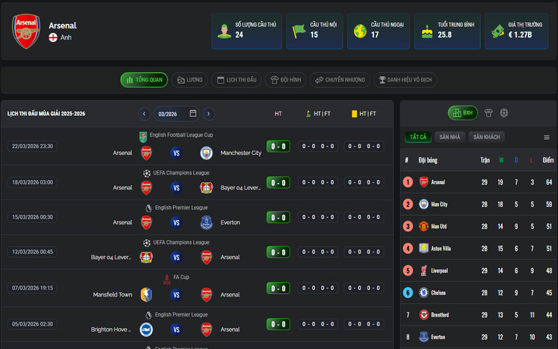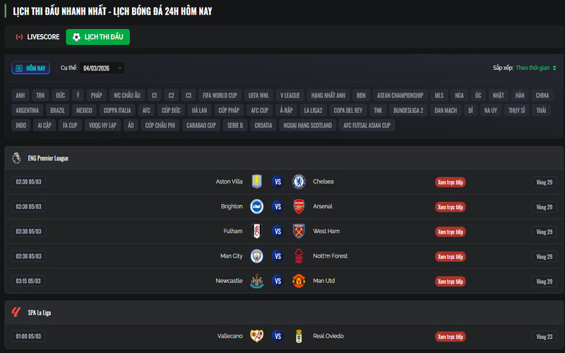 Tại đây, lịch thi đấu đầy đủ 38 vòng của Ngoại hạng Anh được đăng tải chi tiết. Khi truy cập vào chuyên mục, bạn sẽ biết được thời gian thi đấu cụ thể, sân vận động tổ chức, trọng tài chính cũng như đội hình dự kiến của hai đội. Đặc biệt, thông tin thường được cập nhật trước ít nhất 5 ngày so với thời điểm trận đấu diễn ra, tạo điều kiện để người xem chuẩn bị và theo dõi trọn vẹn.
